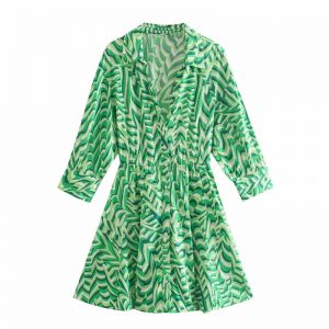 Hot Sale Women Digital Print Green Mini Shirt Dress Female Nine Quarter Sleeve Clothes Casual Lady Loose Vestido D8117